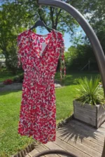 Robe arrivant en dessous du genou , dans son coloris rouge grenade, fushia.